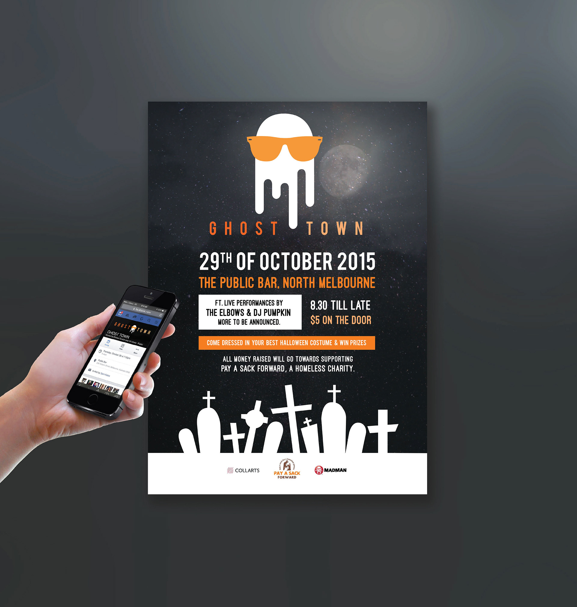 Branding and poster for 'Ghost Town', a Halloween themed night at The Public Bar. The event raises money for the charity, Pay a Sack Forward.