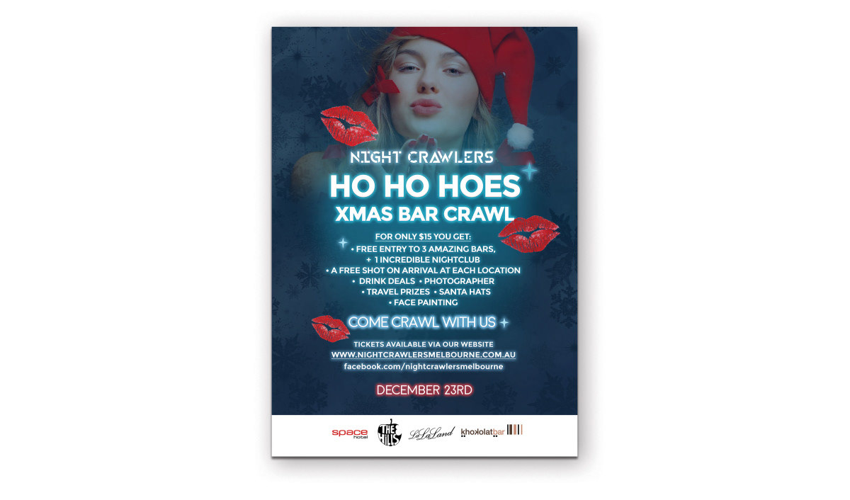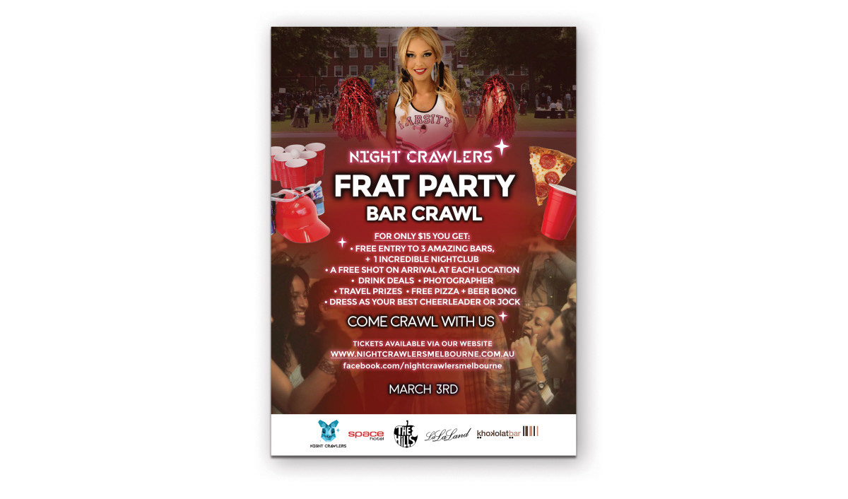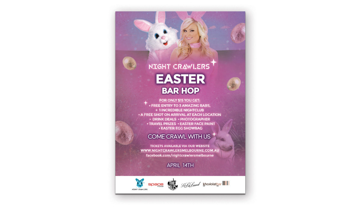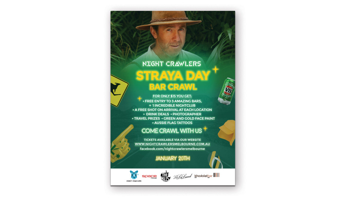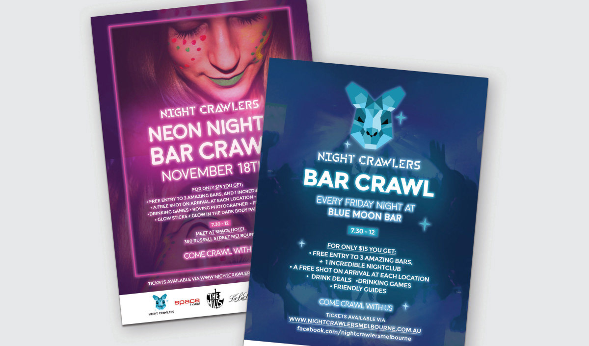 Branding and flyer designs for ‘Night Crawlers’, a bar crawl in the Melbourne CBD, targeted at travellers.